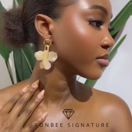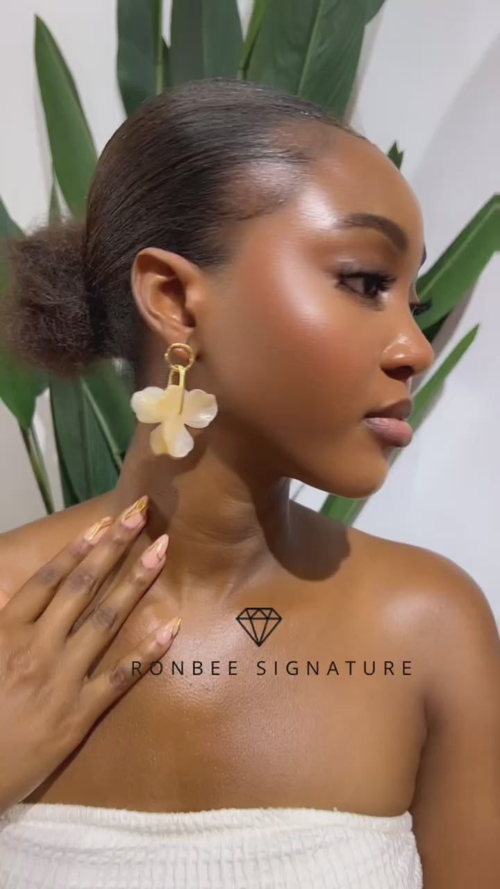 Add an effortless statement to your outfit with these sculptural floral drop earrings. Designed to stand out, the translucent petals and warm golden tones create a soft glow that elevates both casual and dressy looks.